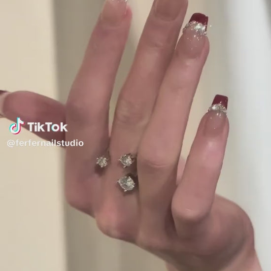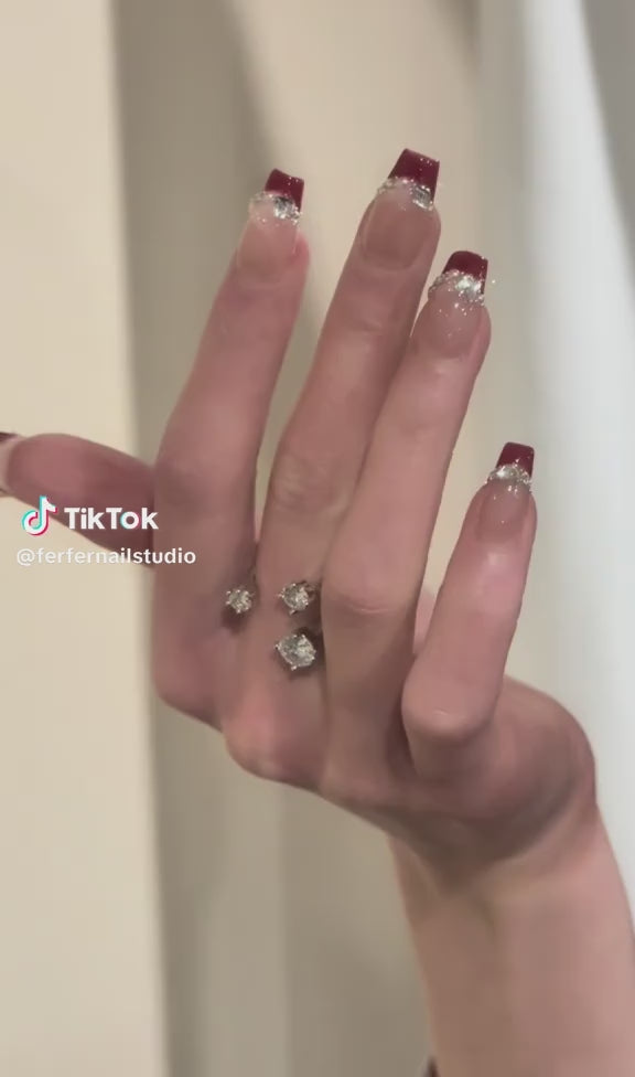 "Waltz" features a soft nude base with a bold ruby-red French tip, framed by a precise line of sparkling gems along the smile line.